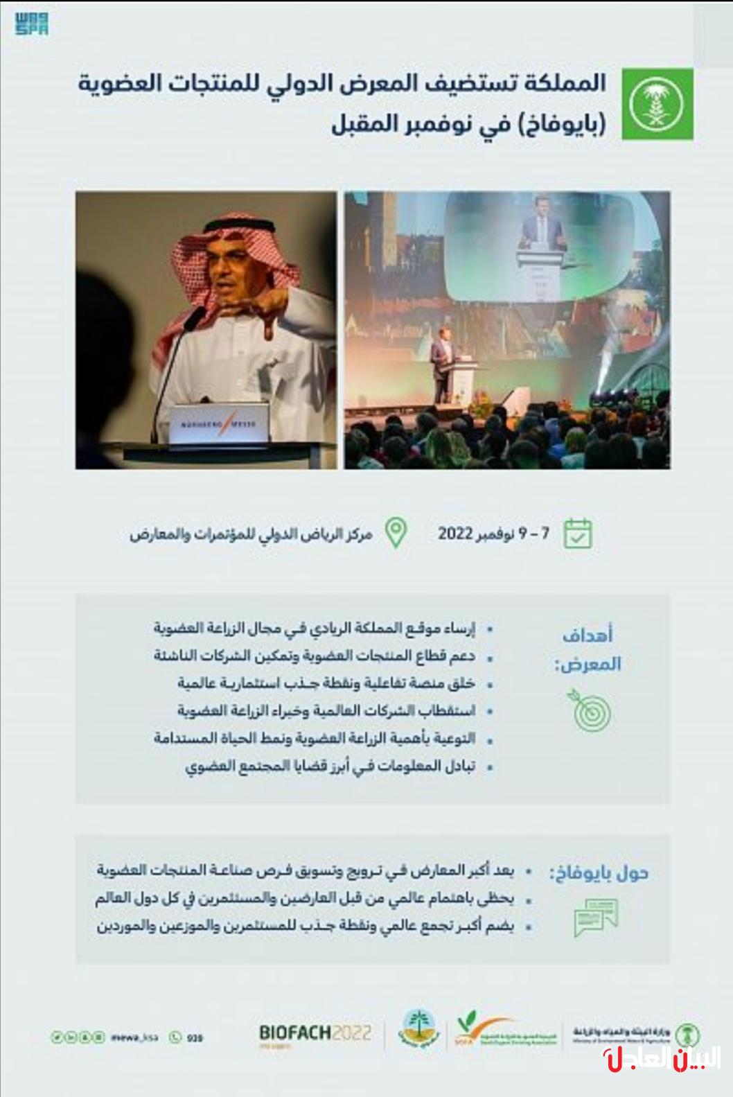 تستضيف المملكة العربية السعودية، المعرض الدولي للمنتجات العضوية (بايوفاخ) والمؤتمر الدولي المصاحب الذي يقام خلال المدة من 7 – 9 نوفمبر 2022م، في مركز الرياض الدولي للمؤتمرات والمعارض.