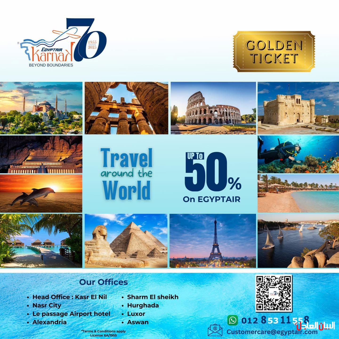 و لأول مرة سوف يتم طرح (التذكرة الذهبية) للعملاء من خلال مكاتب بيع قطاع السياحة (الكرنك) فقط بفروعه بمدينة نصر وقصر النيل ومكاتبه في مختلف المحافظات، والتي سيتم السحب عليها للفائزين بتذاكر طيران مجانية وهدايا أخرى وذلك خلال يوم 9 فبراير 2025 وحتى نفاذ التذاكر الذهبية، وسوف يتم الإعلان عن الفائزين من خلال صفحة قطاع السياحة (الكرنك) على فيسبوك Egyptair Tourism – Karnak