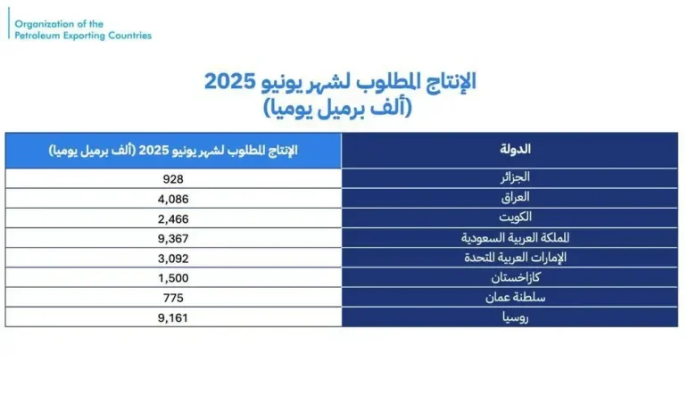 وفي ضوء أسس السوق الإيجابية الحالية، كما يتضح من انخفاض المخزونات البترولية، وبناء على ما اتفق عليه في اجتماع 5 ديسمبر 2024م بشأن الاستعادة التدريجية والمرنة لتعديلات الإنتاج التطوعية البالغة 2.2 مليون برميل يوميًا اعتبارًا من 1 أبريل 2025م، قررت الدول المشاركة تنفيذ تعديل في الإنتاج قدره 411 ألف برميل يوميًا في شهر يونيو 2025م مقارنة بمستوى الإنتاج المطلوب في مايو 2025م، وهو ما يعادل ثلاث زيادات شهرية، كما هو موضح في الجدول المرفق.