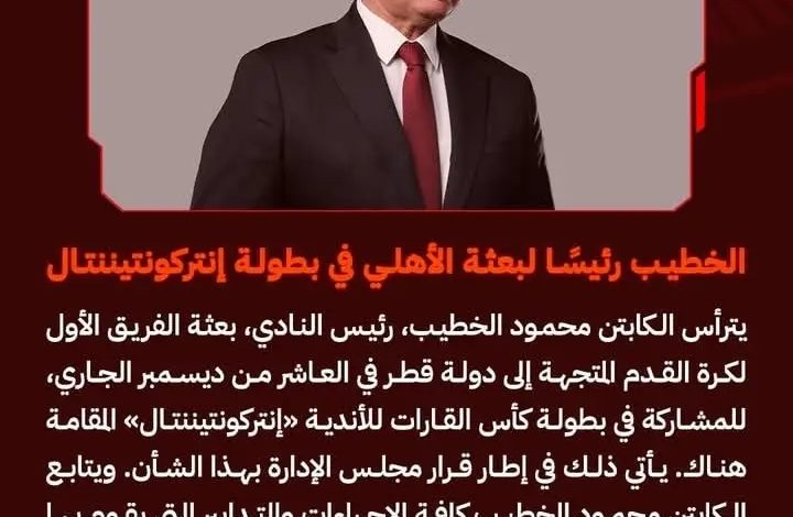 يترأس رئيس النادي الأهلي محمود الخطيب، بعثة الفريق الأول لكرة القدم المتجهة إلي دولة قطر في 10 ديسمبر الجاري، للمشاركة في بطولة كأس القارات للأندية “إنتركونتيننتال” المقامة هناك.