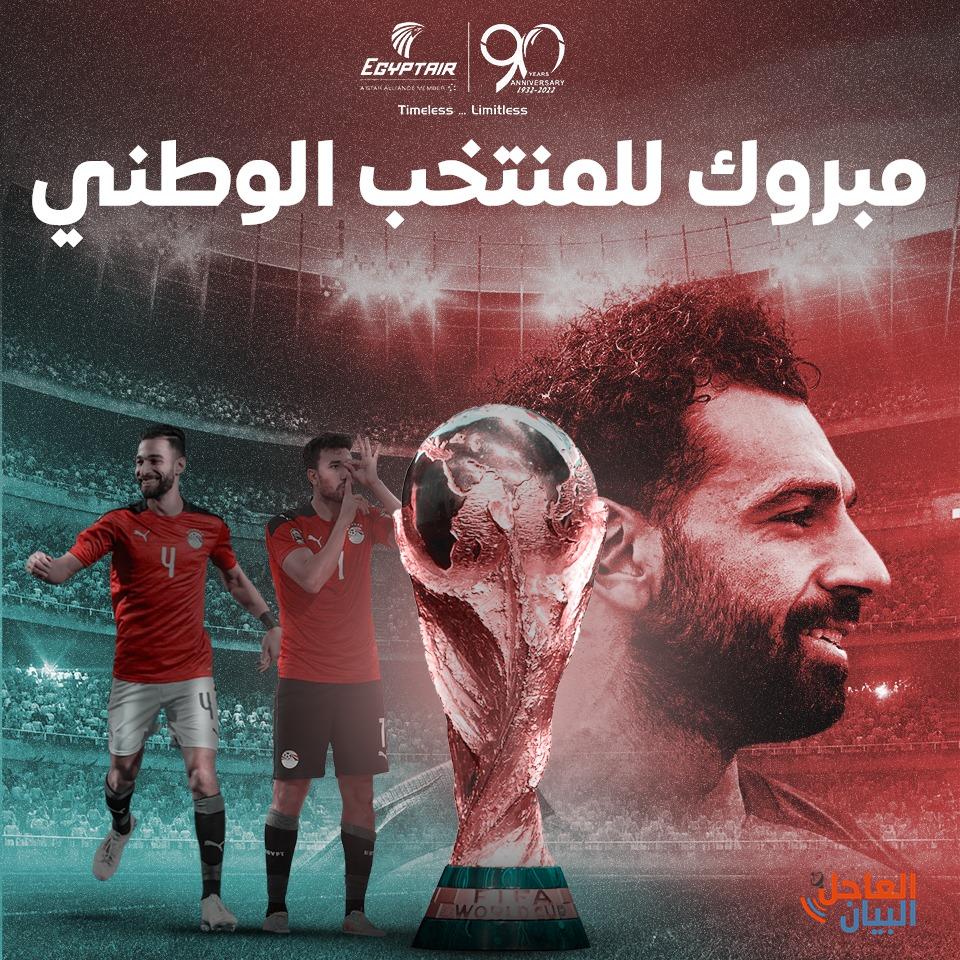 مصرللطيران الناقل الرسمي تهنئ المنتخب المصري بالفوز في مباراة الذهاب علي منتخب السنغال وتتمني له التوفيق في مباراة العودة والوصول لكأس العالم قطر ٢٠٢٢