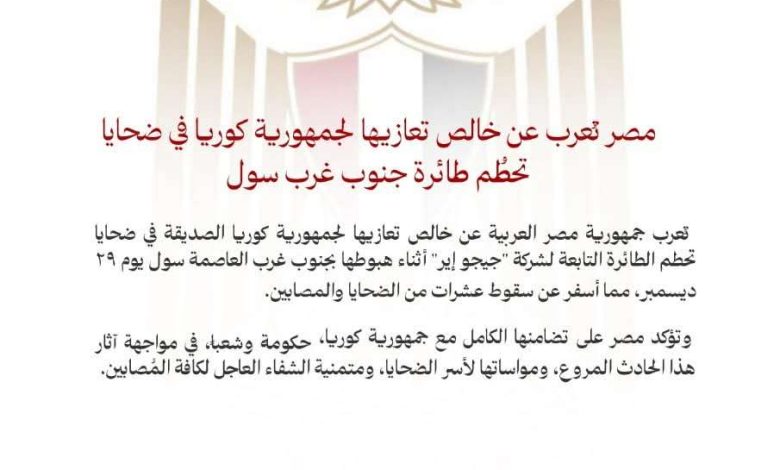 أعربت جمهورية مصر العربية عن خالص تعازيها لجمهورية كوريا الصديقة في ضحايا تحطم الطائرة التابعة لشركة “جيجو إير” أثناء هبوطها بجنوب غرب العاصمة سول اليوم /الأحد/، مما أسفر عن سقوط عشرات من الضحايا والمصابين.