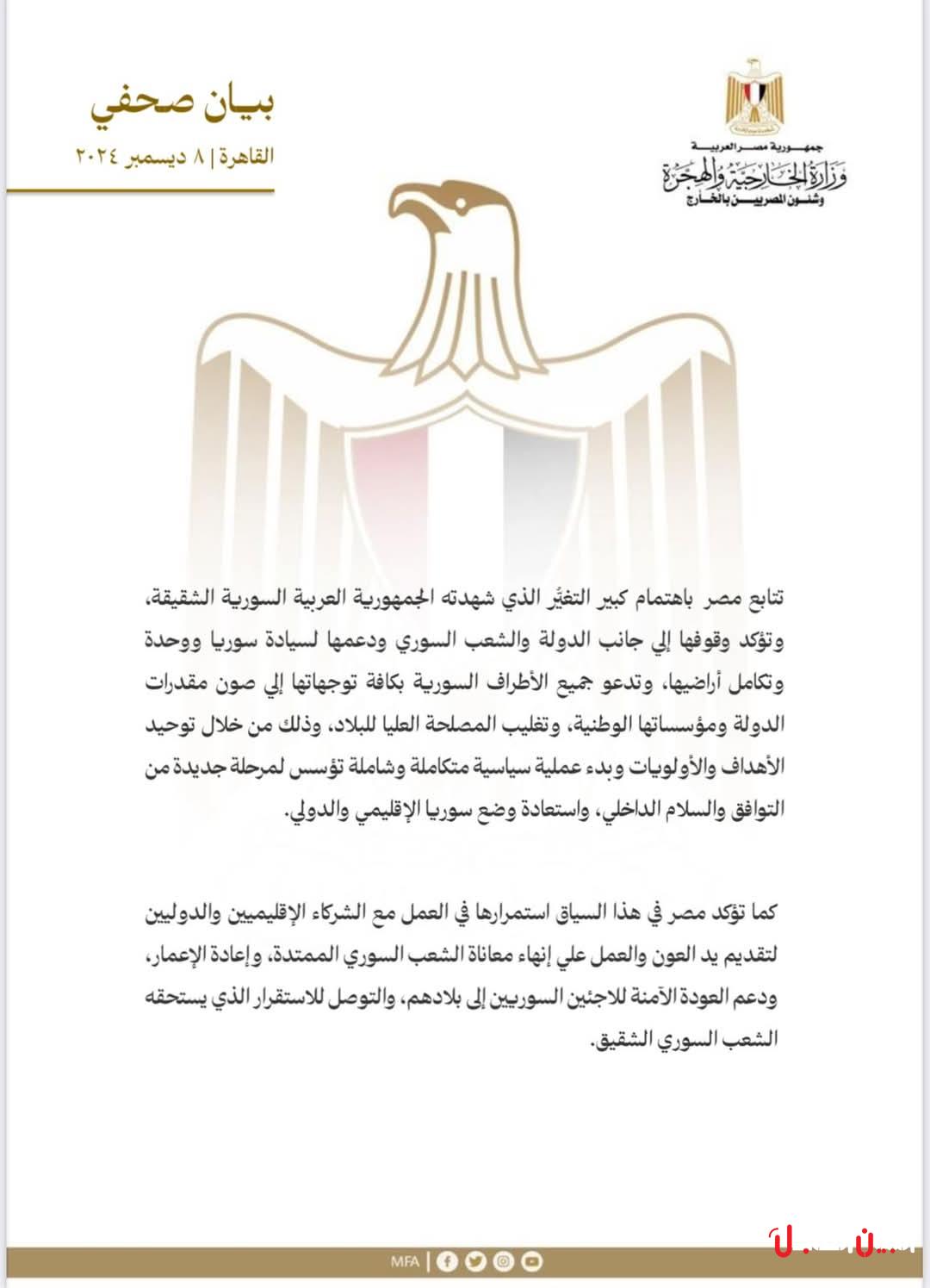 تتابع جمهورية مصر العربية، باهتمام كبير، التغير الذي شهدته الجمهورية العربية السورية الشقيقة، وتؤكد وقوفها إلى جانب الدولة والشعب…