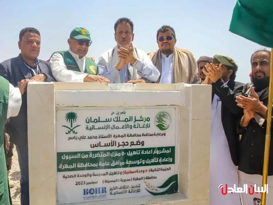 كما دشن مركز الملك سلمان للإغاثة والأعمال الإنسانية، المرحلة الثانية من مشروع إعادة تأهيل المنازل المتضررة من السيول والمرافق الخدمية التابعة لها في مديرية المسيلة بمحافظة المهرة، بحضور محافظ المهرة محمد علي ياسر، والأمين العام للمحافظة سالم نيمر، ومدير عام مديرية المسيلة فضل الدحيمي، ومدير مكتب مركز الملك سلمان للإغاثة بمحافظة المهرة عبدالله العنقري.