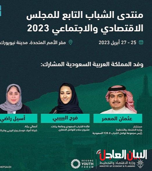 تشارك المملكة في منتدى الشباب التابع للمجلس الاقتصادي والاجتماعي 2023، الذي يقام في الفترة 25 إلى 27 أبريل 2023 في مقر الأمم المتحدة في نيويورك.