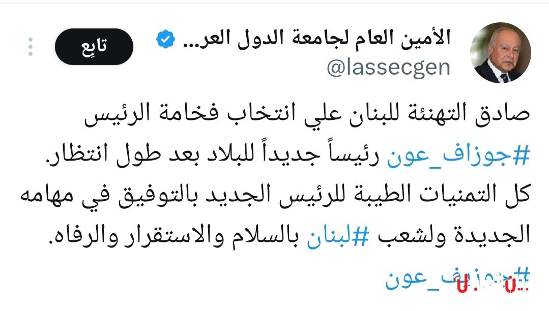 وقال أبو الغيط، في منشور له عبر منصة ×، إن يتقدم بصادق التهنئة للبنان علي انتخاب فخامة الرئيس #جوزيف_عون رئيساً جديداً للبلاد بعد طول انتظار. كل التمنيات الطيبة للرئيس الجديد بالتوفيق في مهامه الجديدة ولشعب #لبنان بالسلام والاستقرار والرفاه.