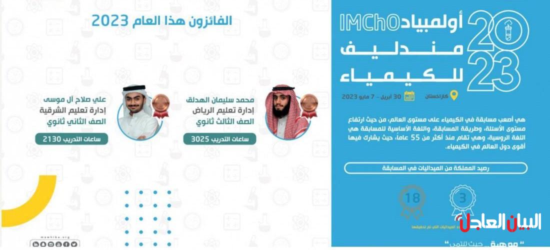 وبهذا الإنجاز، رفعت المملكة رصيدها من الجوائز في أولمبياد مندليف للكيمياء إلى 21 جائزة؛ من بينها 16 فضية و5 برونزيات، وذلك بمشاركة 116 طالباً وطالبة من 21 دولة.ومثـل المملكة في النسخة الحالية من الأولمبياد، فريق مكون من 7 طلاب من مختلف الإدارات التعليمية، حيث فاز الطالب محمد الهدلق، الصف الثالث الثانوي من إدارة تعليم الرياض، الذي تلقى 3025 ساعة تدريبية، بميدالية برونزية، كما حقق الطالب علي صلاح آل موسى، الصف الثالث الثانوي من إدارة تعليم الشرقية، والذي تلقى 3025 ساعة تدريبية، ميدالية برونزية.