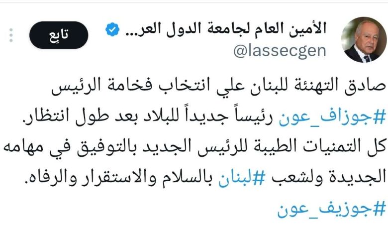 وقال أبو الغيط، في منشور له عبر منصة ×، إن يتقدم بصادق التهنئة للبنان علي انتخاب فخامة الرئيس جوزيف عون رئيساً جديداً للبلاد بعد طول انتظار. كل التمنيات الطيبة للرئيس الجديد بالتوفيق في مهامه الجديدة ولشعب لبنان بالسلام والاستقرار والرفاه.